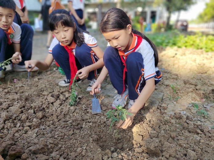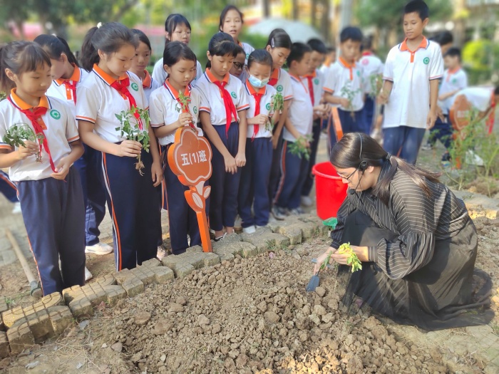 “先用小鏟子挖一個小坑,再把苗放在挖好的小坑里,扶正,然后將泥土輕輕按壓在根部……”老師一邊示范一邊向學生們講解種植方法。隨后,孩子們在老師的帶領下開始親自動手實踐:挖坑、放苗、壓土……忙得不亦樂乎。不一會兒功夫,地里立起來了一株株小菜苗,菜園里一片歡聲笑語。