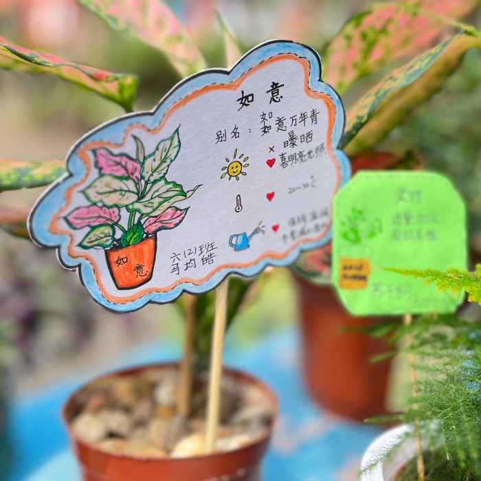 此外,學校倡議同學們將自己栽種的小盆栽帶到學校進行展示,并為植物畫一張介紹卡,為校園增添一抹綠色。一盆盆綠意盎然的植物就像一道道綠色的風景,將校園裝點得生機勃勃、色彩明快。美術老師帶著同學們奔赴一場春的約會,尋著“春”的足跡開啟尋“綠”之旅,將找到的綠色制作成美麗的貼畫。一幅幅精美的作品,無不體現了同學們對春的詮釋和喜歡。
