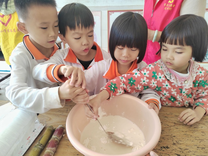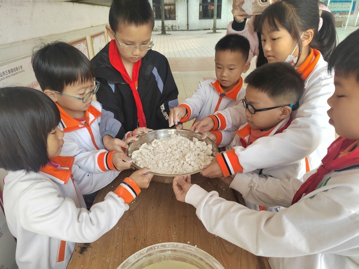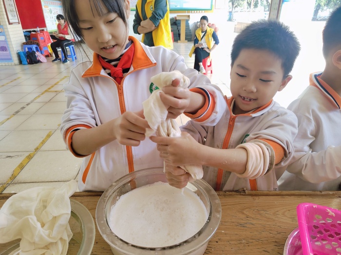粉葛是大自然中一個名副其實的寶,具有消暑、解熱、清毒等特點。活動最后,同學與家長們以互動合作的形式將新鮮挖出的粉葛制作成細膩清香的葛粉。挖粉葛、洗粉葛、切塊根、磨漿濾水、曬葛粉,同學們用汗水澆灌出豐收的快樂,不僅收獲了一碗香甜的葛粉雞蛋糖水,更懂得了“一蔬一飯當思來之不易”的道理。