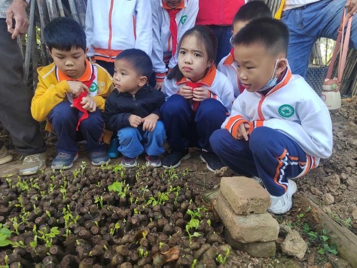 阡陌縱橫間,同學們在沙欄村粉葛種植基地梁德有伯伯的帶領下第一次看到了粉葛苗,一棵棵嫩綠的粉葛苗整齊地排列在眼前。有的同學瞪著大大的眼睛去觀察粉葛苗并記錄生長情況,還有的同學積極向梁伯伯詢問粉葛的生長周期、育苗要領等,感受粉葛生命的力量。