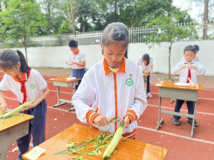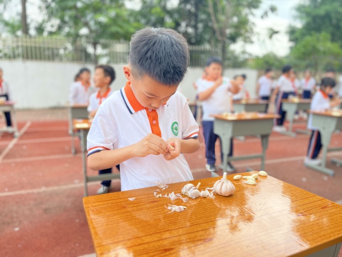 一年級進行的是剝蒜頭比賽,同學們雖然年紀小,但是剝起蒜頭來可是有模有樣。孩子們全力以赴,快速地完成比賽任務,爭先恐后地舉起自己的小手示意已經完成比賽。評委老師根據學生剝蒜頭的數量、完整度進行打分。二年級進行的是打雞蛋比賽。同學們動作迅速,手法嫻熟,打出的蛋液均勻、細膩。三年級的同學們低著頭認真地削著青瓜,他們一手握緊青瓜,一手握住削皮器,小心翼翼地削起皮來。雖然青瓜的形狀并不規則,但在同學們的手中異常乖巧,不一會兒瓜皮就被削得干干凈凈。