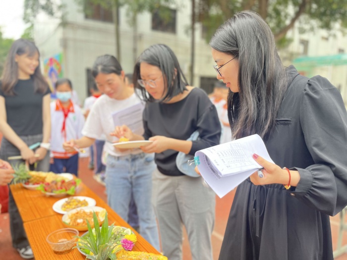四年級同學的比賽項目是包餃子。同學們熟練地放餡料、捏餃子,十指翻飛之間,一只只餃子就誕生了,包出的水餃形態各異,很是精致。五、六年級同學的比賽項目是做一道拿手菜。比賽過程中,選手們各顯身手:熱鍋、下油、下菜、翻炒、調味……16名小廚神的動作嫻熟,看得旁邊的評委們嘖嘖稱贊。在鍋碗瓢盆的碰撞中、在油鹽醬醋的交融中,一道道色香味俱全的菜品陸續出鍋。同學們進行了精心的擺盤。在認真品嘗完每一道菜肴后,評委們根據每道菜肴的色、香、味、形進行逐一評分。