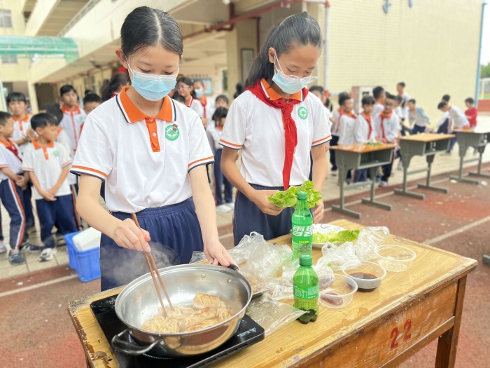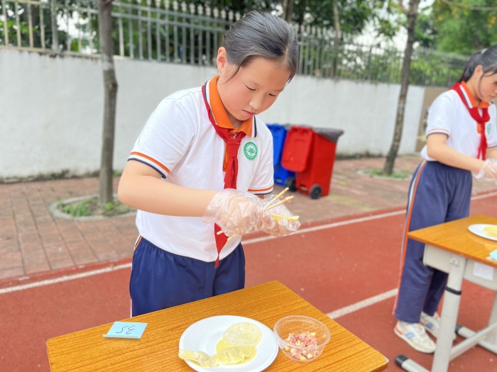 此前,各個班級通過“學習強國”平臺收集相關日常生活技能和烹飪技能的視頻讓學生回家學習,然后進行了初賽選拔。各班評選出比賽用時最短、任務完成最好、精神面貌最好的同學參加復賽。