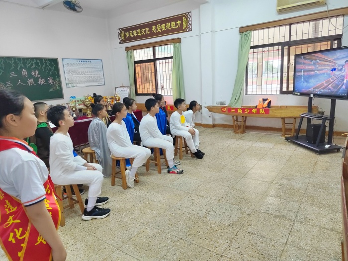 隨后,三角鎮光明小學德育主任林秋影向大布小學的師生介紹了三角鎮三人根艇賽的概括。接著,光明小學非遺小宣講員帶領大家參觀了學校的非遺傳承基地,小宣講員用生動的語言向大家展示了三人根艇賽的獨特魅力。