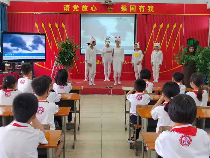 活動開始,三鄉鎮大布小學氣象社團的同學們展示了科普劇《誰是打臺風》,科普劇以學生喜聞樂見的課本劇為藍本,以臺風“洋洋得意”吹襲羊村的故事,將臺風的知識、危害以及做好臺風預防措施變成課本劇,讓學生在輕松的氛圍下學習氣象知識,讓科學知識更深入地扎根在學生的心中,與青山綠水共為鄰。