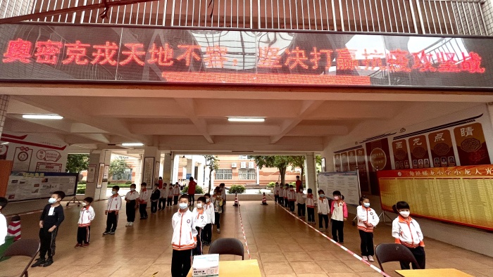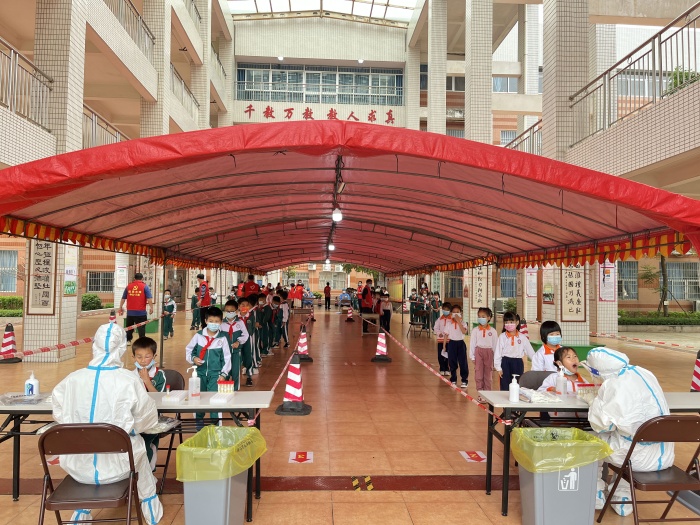 當天一早,蟠龍小學黃文景校長帶領行政人員和教師志愿者提前來到檢測點位,做最后的準備工作。學生按預設的時間和班級順序到達檢測點位,所有學生服從班主任安排,聽從現場工作人員的指揮,嚴格按照要求佩戴口罩、間隔一米,做到安靜有序、文明有禮。