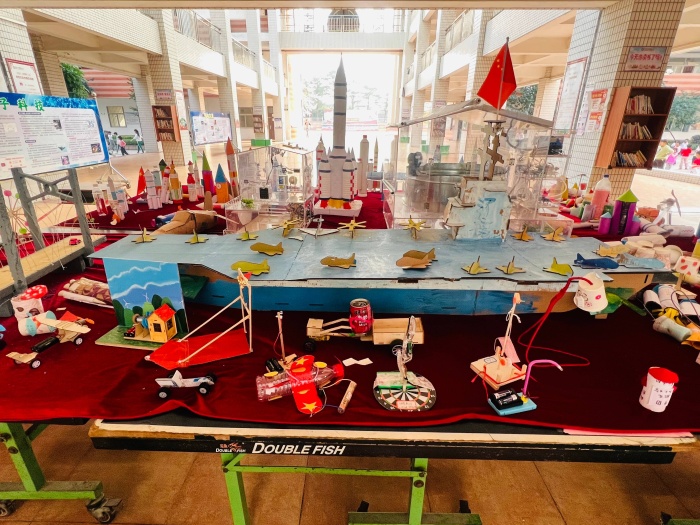 科技創新小發明是孩子們動手實踐、展示自我的一個平臺。學生們利用木板、紙盒、卡紙、瓶子等各種材料,制作出了神舟飛船、長征火箭、天宮空間站、各種大橋等一個個精巧的模型。學生們也在理解科學知識的基礎上,通過科學的想象,運用繪畫表達出對宇宙萬物、未來人類社會生活、科學技術的遐想。