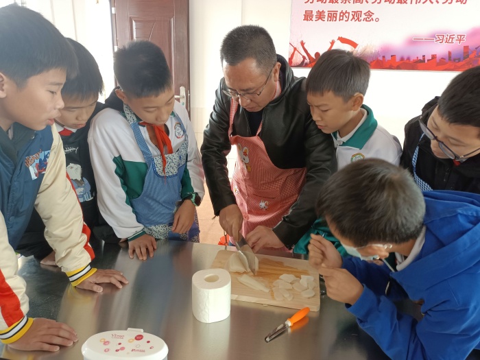 12月13日上午,蟠龍小學校長黃文景在勞動技能訓練室親自示范了《烹飪蘿卜竹筍生魚片》勞動烹飪課,手把手教學,從烹飪的學習到習慣的養成黃校長都細無巨細地指導學生。