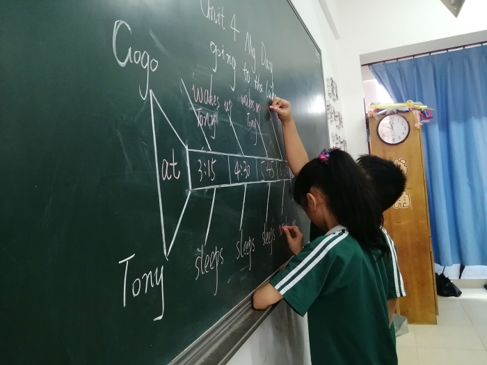 四年級的郭鳳鈴老師執教Unit4 My Day的故事課,圖形組織者貫穿整節課的教學。郭老師以圖促讀,引導學生仔細觀察圖片,帶著問題學習故事,激發閱讀動機。同時,郭老師循循善誘,給學生示范如何一邊閱讀故事,一邊制作魚骨圖。在支架的幫助下,學生自主閱讀故事剩下的部分,小組合作完善魚骨圖。最后,郭老師引導學生借助魚骨圖復述故事,促進學生對文本的理解和掌握,進一步發展學生的語用能力。在學習能力培養的同時,郭老師也有意識地幫助形成學生的文化品格,滲透情感價值觀:在合適的時間做合適的事情,凡事要做好詳細的計劃。