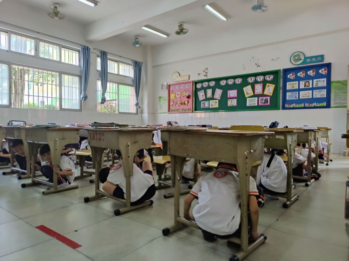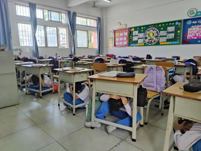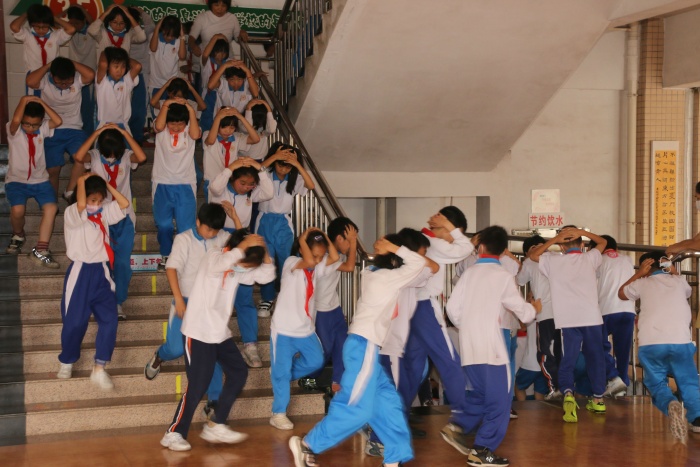 為了實(shí)施好這次演練,學(xué)校制定了詳細(xì)的防震疏散演練方案,對(duì)各班疏散的路線及每位班主任老師的職責(zé)、每層樓梯口值班老師的職責(zé)、疏散路線指揮員的職責(zé)等內(nèi)容都作了明確的規(guī)定。演練開(kāi)始前,各班主任充分運(yùn)用視頻、圖片、文字等通俗易懂的方式,詳細(xì)講述了在地震來(lái)臨的時(shí)候應(yīng)當(dāng)如何有效進(jìn)行避震、安全自救、逃離到安全位置等相關(guān)知識(shí)。下午4點(diǎn)整,防震演練開(kāi)始,第一次警報(bào)響起,上課教師立即停止授課,告知學(xué)生“地震來(lái)了,不要慌”,并指揮學(xué)生迅速抱頭、閉眼,躲在各自的課桌下或課桌旁,盡量蜷曲身體,降低身體重心,并盡可能用書(shū)包保護(hù)頭部。緊接著,第二次警報(bào)響起,班主任立即組織學(xué)生進(jìn)行疏散逃生演練,組織本班學(xué)生排隊(duì),聽(tīng)從樓層負(fù)責(zé)人指揮,按疏散路線指導(dǎo)學(xué)生有秩序地迅速撤離;各年級(jí)師生在學(xué)校的指揮下,到達(dá)指定位置,整個(gè)過(guò)程秩序井然。