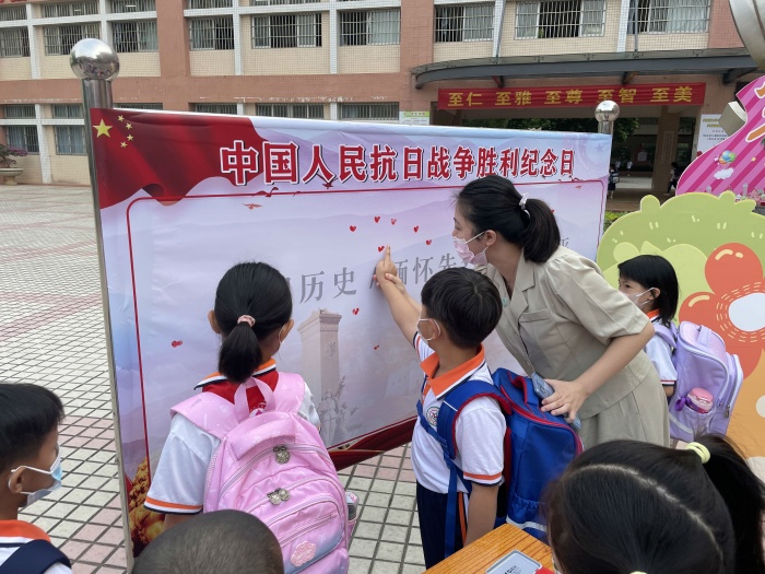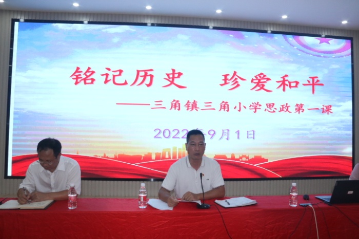 為深入貫徹習近平總書記關于“大思政課”建設的重要指示精神,陳校長還以《銘記歷史,珍愛和平》為主題,為全體學生講授開學第一堂思政課。9月3日正是中國人民抗日戰爭及世界反法西斯戰爭勝利77周年紀念日,為緬懷英烈,傳承紅色基因,陳校長帶領全體學生回顧了中國人民抗日戰爭的崢嶸歲月,向同學們講述了抗日戰爭的相關歷史、抗日戰爭的偉大意義,同學們端坐在座位上,認真傾聽,時不時點點頭,好像暗下決心,默默樹立為國爭光的信念!陳校長最后向全體學生提出新學期寄語,希望全體學生大力弘揚偉大抗戰精神,磨練堅強意志,努力做祖國和人民需要的好孩子。