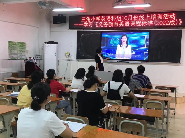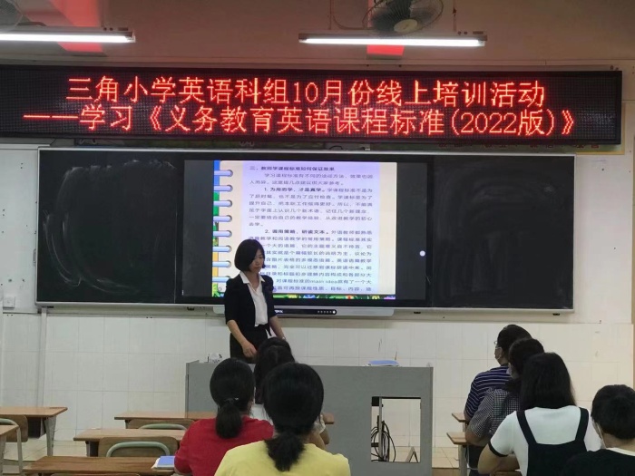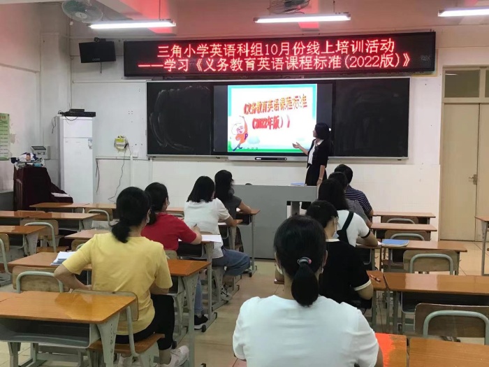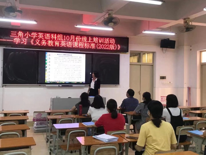 為更好地使用新教材、改進課堂教學、提高課程育人能力,10月27日下午,三角小學英語科組全體教師在多媒體室共同學習了《義務教育英語課程標準(2022年版)》,并深入研讀了新課程標準學習的重要內容。