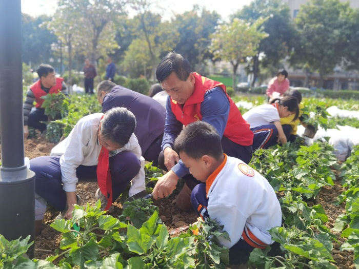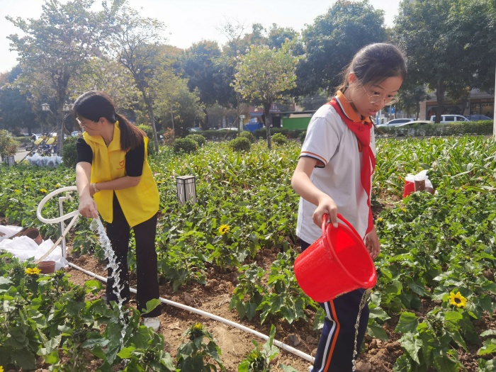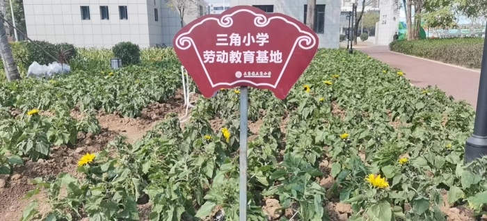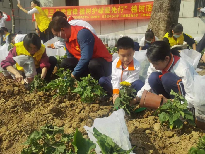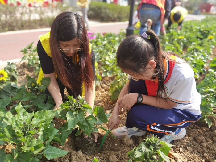 上午九點半,三角小學(xué)的孩子們佩戴鮮艷的紅領(lǐng)巾,家長們身穿志愿者馬甲和帶隊行政、老師們一起抵達三角文化廣場。活動伊始,由三角小學(xué)陳見洪校長講解本次活動的意義和注意事項。緊接著,三角小學(xué)親子義工服務(wù)隊在黨員志愿者的帶領(lǐng)下有序地進行分組,經(jīng)過學(xué)校德育處吳主任以及勞動基地負責人的簡單講解后,大家紛紛有序地領(lǐng)取植樹工具與向日葵花苗,當起了“園藝工程師”。親子義工們拿起工具,分工合作,挖坑、扶苗、培土、澆水,每個環(huán)節(jié)銜接有序、有條不紊,植樹現(xiàn)場一片熱火朝天。
