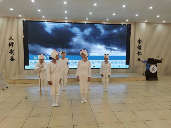 接著由中山市三鄉鎮大布小學氣象社團帶來精彩的科普劇表演。大布小學的氣象社團一直得到中山市氣象局、中山市氣象學會的支持,以創新社團形式推廣氣象科普知識。大布小學嘗試以學生喜聞樂見的課本劇為藍本,以臺風“洋洋得意”吹襲羊村的故事,將臺風的知識,臺風危害以及做好臺風預防措施變成課本劇,讓學生在輕松的氛圍下學習氣象知識,讓科學知識更深入的扎根在學生的心中,與青山綠水共為鄰。