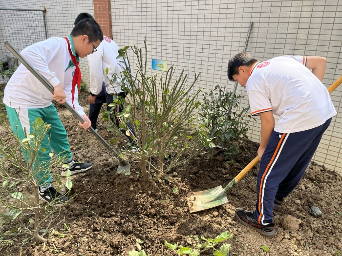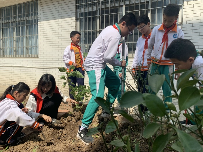 在少工委主任崔煥英的帶領(lǐng)下,隊員們來到了學(xué)校的勞動教育基地進行勞動。隊員們有挖坑的,有扶著樹苗的,有填土的,還有提著水桶來回澆水的,打支撐的,干得熱火朝天。雖然有些是第一次參加植樹,動作稍顯笨拙,但絲毫不影響他們對植樹節(jié)勞動的積極與熱情。