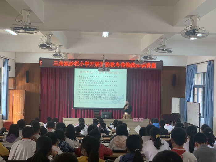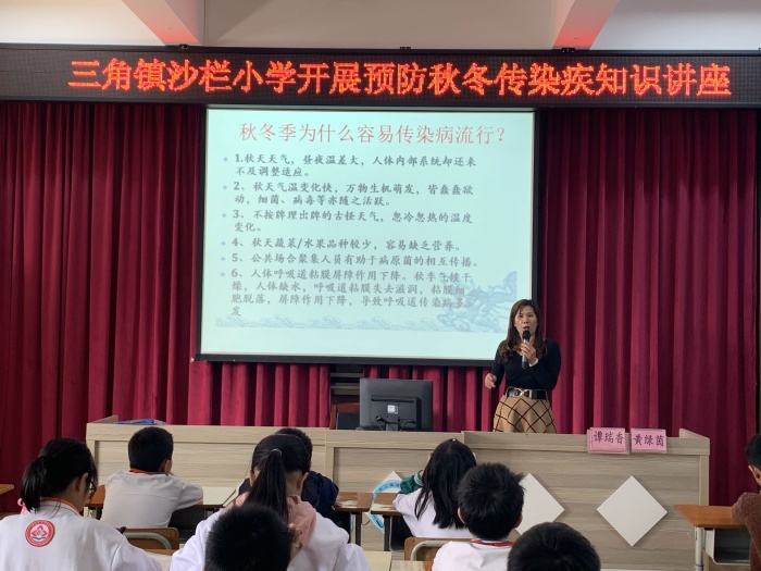 秋冬季是傳染病的多發(fā)季節(jié),一些病毒性傳染病也隨之而來,尤其是12月份正值冬季,天氣多變,時寒時暖,是麻疹、水痘、流感等呼吸道傳染病的高發(fā)期。學(xué)校是人員密集的地方,傳染性疾病極易傳播流行。因此學(xué)校牢固樹立“人人預(yù)防,個個健康”的理念,為預(yù)防傳染病的發(fā)生,保護全校師生的身心健康,也為了增強全校師生對預(yù)防傳染疾病的關(guān)注和重視。為了增強師生對秋季傳染病的預(yù)防保健意識,讓學(xué)生遠離傳染病,健康快樂地成長,12月13日下午,沙欄小學(xué)舉辦了一次秋冬季傳染病預(yù)防知識講座。