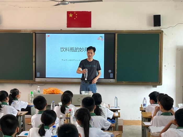 首先是課堂教學展示。中山市三角鎮中心小學馮細有老師獻上科學課《飲料瓶的妙用》。馮老師利用飲料瓶、水、小玻璃瓶等道具,先演示了玻璃瓶在裝滿水的瓶子里上下浮動,再叫同學上來嘗試,然后解釋了其原理,引導學生自主探究,讓他們利用實驗原理自己動手實驗。相信試驗成功的學生心中充滿了成就感。