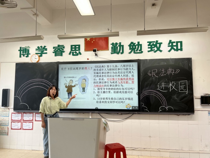 班隊(duì)課上,班主任向同學(xué)們介紹了民法典的概況,從“民法典與小明一生”的故事切入,生動(dòng)形象地向同學(xué)們講解了《民法典》中涉及民事行為能力、人格權(quán)、高空拋物等與日常生活息息相關(guān)的法律條款,利用典型案例深入剖析了背后的法理知識(shí),把“紙上的法律”變?yōu)椤艾F(xiàn)實(shí)生活中的法律”。同學(xué)們聽(tīng)得津津有味、深受啟發(fā)。活動(dòng)結(jié)束后,同學(xué)們紛紛表示要做勤奮好學(xué)的好學(xué)生,遵紀(jì)守法的好公民。