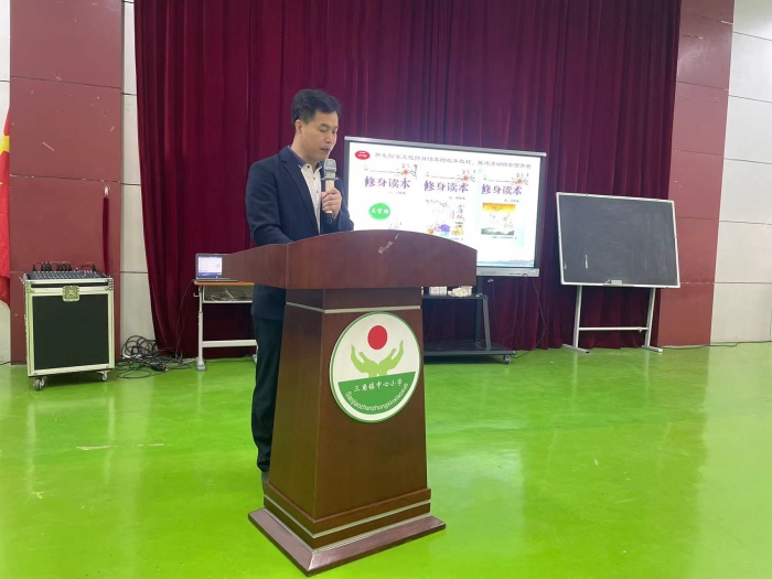 接著,吳博事校長就學校的傳統文化教育教學實踐開展情況,從校園文化的定位、校園文化的建設與實施、校園文化的工作設想三個方面作了題為《立足五常教育,傳承孔子文化》的專題匯報。