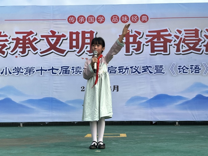 教師代表付麗麗老師宣讀了讀書節倡議書,她號召同學們讀詩、讀詞、讀曲、讀天下文章;書山、書水、書情、書心中感想;閱讀經典,閱讀精神,閱讀中華!立德、立志、立人,傳承中華文明,傳承中華血脈!呼聲迭起,聲聲入心。六(3)班學生代表池宇恒和三(6)班學生代表梁楚琳分別做了《優秀為鄰 書香做伴》和《至樂不如讀書》的倡議。他們都倡議大家用讀書來溫潤、豐盈自己的人生,用閱讀通古追遠,珍惜最佳的讀書時光。