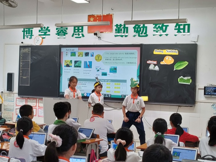 在本次課例研討活動中,梁焯歡老師以大貓英語校園版四年級上冊的繪本故事教學為載體,將智能交互技術和英語學科進行融合,呈現了《Doing Nothing》一課的課堂教學。梁焯歡老師執教時,充分利用歌曲、動畫、C30智能平臺、愛種子評價平臺等信息技術形式,渲染課堂氣氛,提升課堂的趣味性,營造真實的語言學習環境。課堂上,梁老師運用動物的擬聲詞出現為主線,引導學生展開想象,想象故事情節的發展,學生在智能技術的輔助下學習答題,更能深入體會小青蛙的情感變化。