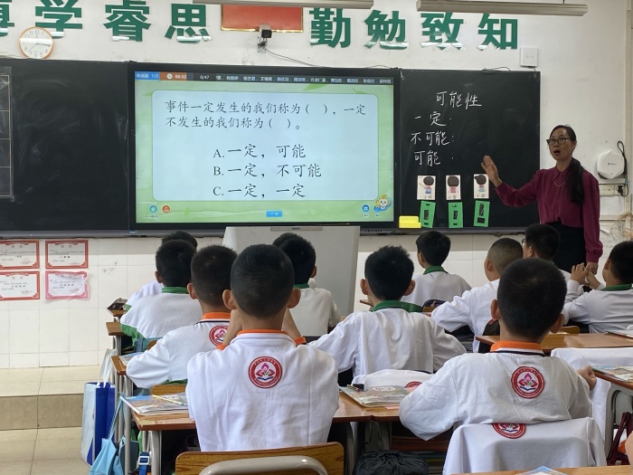 本次活動(dòng)由課題組成員陳平芳副校長(zhǎng)執(zhí)教數(shù)學(xué)課例《可能性》,這是人教版教材五年級(jí)上冊(cè)第44頁(yè)例1和第45頁(yè)“做一做”的教學(xué)內(nèi)容。陳副校長(zhǎng)利用“愛種子”自主學(xué)習(xí)模塊,通過“生活現(xiàn)象——個(gè)別探究——協(xié)作建構(gòu)——練習(xí)檢測(cè)”四個(gè)課堂活動(dòng),精心展開教學(xué),讓學(xué)生在自主學(xué)習(xí)與小組合作中達(dá)到對(duì)新知識(shí)的融會(huì)貫通。最后的“達(dá)標(biāo)測(cè)評(píng)”環(huán)節(jié),既是教師對(duì)學(xué)生學(xué)習(xí)效果的課堂檢測(cè),也是學(xué)生對(duì)自主學(xué)習(xí)效果的反饋。整個(gè)教學(xué)過程中,陳副校長(zhǎng)充分引導(dǎo)學(xué)生積極參與課堂,體現(xiàn)學(xué)生的學(xué)習(xí)主體作用,使學(xué)生樂于探究,積極思考,會(huì)質(zhì)疑、交流、合作,主動(dòng)獲取知識(shí)。同時(shí),通過學(xué)生的答題反饋,老師及時(shí)掌握學(xué)生的學(xué)習(xí)情況,及時(shí)糾正知識(shí)中的錯(cuò)誤。