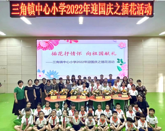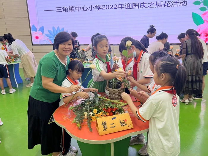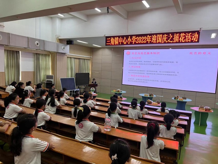 插花藝術是人們喜聞樂見的一門藝術。為慶祝新中國七十三周年華誕,迎接黨的二十大勝利召開,2022年9月29日下午,三角鎮中心小學在學校階梯室開展迎國慶插花活動。來自各班的36位學生、10位學校行政及16位教師代表參與本次活動,學校德育處主任陳結嫻擔任本次活動主持人。