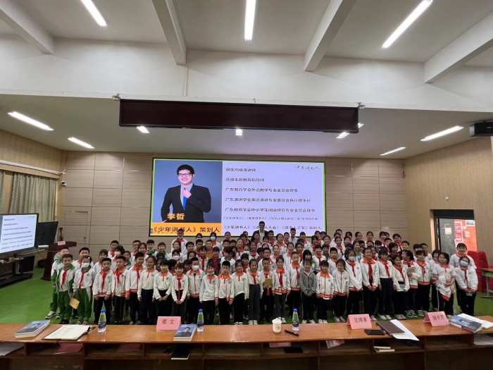 廣東省《少年講書人》電視展評活動策劃人兼專家團成員、國家高級演講師李哲老師和《少年講書人》組委會成員陳秀文老師等一行攜著“講書”春風蒞臨三角鎮中心小學,分享講書經驗。三角鎮教育和體育事務中心副主任梁文、中心小學校長吳博事等全體行政、學校各班學生代表、文學社輔導老師和社員參與了此活動。