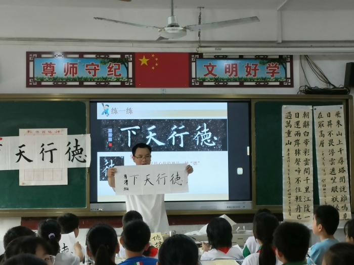 接著是馮高佳老師獻上四年級書法課《雙人旁》。馮老師以故事導入,引導學生仔細觀察,學生了解了雙人旁的寫法以及在結字中的運用,通過一步步練習,學生把“德”字寫得結構勻稱、端正整潔。最后馮老師把課堂延伸到社會主義核心價值觀就是一種“德”,讓學生明白了學習書法就是修身養性,踐行“社會主義核心價值觀”。由于條件有限,高厝寮小學的學生基本都是第一次接觸書法,但短短的一節課下來,學生的作品完成度出乎意料,贏得了在場所有老師的贊美。馮老師的這節書法課對學生來說既是甘霖雨露,更是學習書法路上的一顆啟蒙種子!