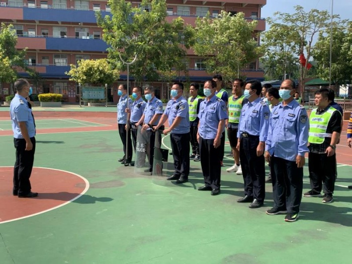 接著,鄭觀明警官和黃偉龍警官宣布大家進入“突發事件應急處置”演練環節。情境設定:由一名便衣民警同志模擬充當危險分子的角色,手持兇器對護校隊員進行攻擊,試圖沖擊校園安保防線。護校隊當即進入突發情況應急狀態,保安和護校隊員們快速組成合作小組,一邊利用手中的鋼叉、盾牌和警棍等器械與危險分子周旋,同時啟動一鍵報警系統,護校隊員們各就各位,迅速聯系肖家村派出所和西山村委治保會力量,協力將危險分子制服。