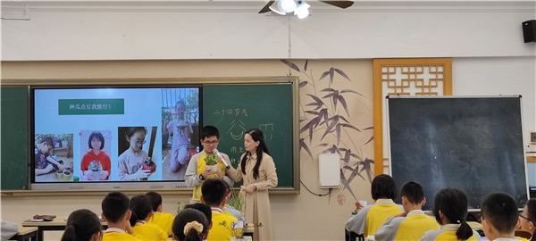 隨后,曾青竹老師在文學(xué)社展示一節(jié)傳統(tǒng)文化課例——《谷雨》。曾老師采用小組學(xué)習(xí)的方式,引導(dǎo)學(xué)生課前搜集與谷雨節(jié)氣有關(guān)的知識:節(jié)氣起源、節(jié)氣特點、節(jié)氣風(fēng)俗、與節(jié)氣有關(guān)的詩歌等,并種植適合這個季節(jié)生長的植物。放眼教室,一盆盆綠植映入眼簾,孩子們興趣盎然地分享自己收集到的資料以及種植的體驗,在生動活潑的課堂氛圍中,孩子們逐漸加深對谷雨節(jié)氣的理解。接著,曾老師給孩子拓展學(xué)習(xí)了一些和谷雨有關(guān)的詩歌,并帶領(lǐng)孩子學(xué)習(xí)吟唱,讓孩子們對谷雨節(jié)氣有了更深入的了解,收到了很好的教學(xué)效果,得到了專家組的充分肯定。