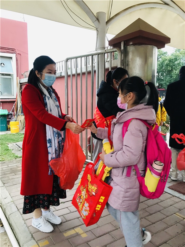 三鄉(xiāng)鎮(zhèn)白石環(huán)小學(xué),紅色外墻沐浴著晨曦,透著濃濃的新春氣息,一副長長的對聯(lián)高掛在教學(xué)樓前,廣場旁的草地上帶著虎娃的“新年好”赫然醒目,樹上吊著學(xué)生的各式手工燈籠。校門口,全體行政、值日教師和4位禮儀隊(duì)員滿面笑容分別在列隊(duì)正門與側(cè)門,給到校的每一位師生發(fā)新年禮物——利是封,利是封里裝著利是糖、棒棒糖和祝福書簽。千余名師生接過禮物,相互祝福著,邁著輕快的腳步進(jìn)入校園,走進(jìn)具有同樣春意的教室,教室的黑板上寫好了歡迎詞,掛上了學(xué)生相關(guān)“春”的作品。
