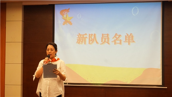 莊嚴宣誓后,一(4)中隊的張景行隊員作為新隊員代表發言,他表達了無比愉悅的心情和積極向上的決心。學校少工委大隊輔導員鐘老師為各個中隊授中隊旗;德育主任謝萬明主任為一年級各中隊的中隊輔導員頒發聘書,看著鮮艷的紅領巾和矗立的中隊旗,新隊員們異常興奮,全場響起了熱烈的鼓掌聲和吶喊聲。