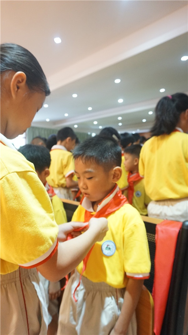 為迎接這次入隊儀式的到來,一年級各中隊提前開展了隊前教育,觀看隊知識視頻、學習隊歌、填寫入隊申請書……幫助新隊員們樹立“紅領巾小主人”意識。7月10日上午8點,一年級同學穿著整齊的校服,踏著堅定的步伐有序地來到階梯室,等待著他們人生中第一次意義非凡、激動人心的時刻——加入光榮的中國少年先鋒隊組織。
