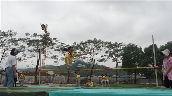 跳遠的運動員們也同樣不遜色,使勁全身力氣在飛躍。跳高區域,裁判員的一個手勢,運動員隨即助跑、起跳、跨越、著墊,一連串的動作,贏得了伙伴們的一片叫好聲。