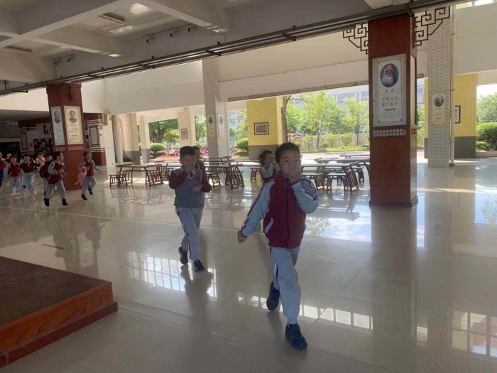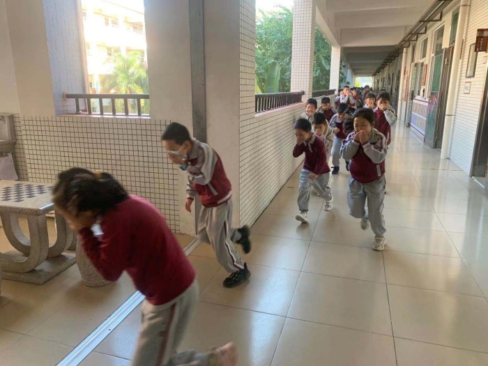 上午9:52分,當(dāng)學(xué)校廣播室發(fā)出的防空警報(bào)信號(hào)后,正在上課的全校學(xué)生,在任課老師的組織引導(dǎo)下,迅速撤離教室,按指定路線有序疏散逃生。頓時(shí),學(xué)校各樓層走廊上、各樓梯上人頭攢動(dòng),各班都是分為兩列縱隊(duì),手捂住口鼻,快速、有序地向操場(chǎng)撤離。