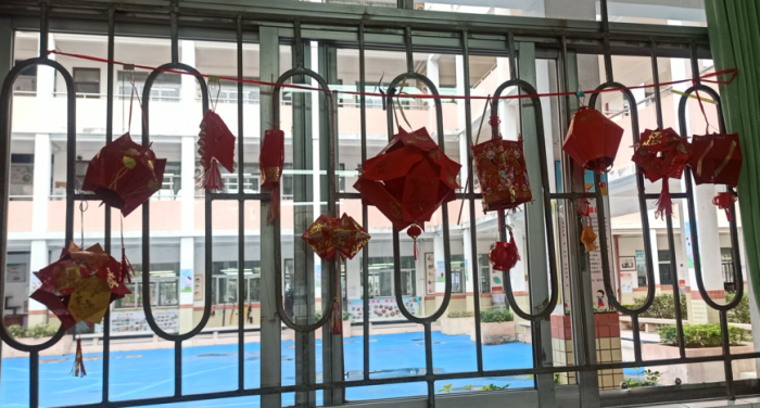 為營造濃厚的節(jié)日氛圍,在寒假期間各班孩子們與家長一同制作燈籠或春節(jié)有關的剪紙等手工。孩子們充分利用彩紙、利是封、空瓶子等身邊的材料,變廢為寶,制作出了一個個創(chuàng)意無窮的環(huán)保花燈,迎接元宵節(jié)的到來。走在教學樓的走廊上,處處張燈結彩, 一個個精美的花燈,吸引了師生們紛紛駐足,他們時而欣賞,時而贊嘆。一盞盞花燈成了校園里一道喜氣洋洋的風景,整個校園充滿了元宵節(jié)的喜慶氣氛!