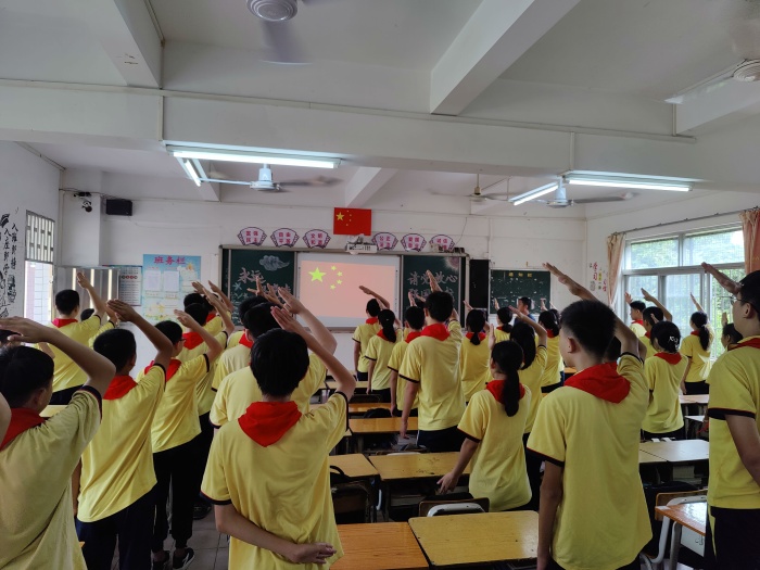 華強學校少工委主任、校長劉鍵給隊員們上了一堂生動的黨課,他告訴同學們:“作為新時代的青少年,一定要樹立共產主義遠大理想,堅定信仰信念,永遠感黨恩、聽黨話、跟黨走,扣好人生的第一粒扣子,積極踐行社會主義核心價值觀,繼承革命優良傳統,弘揚中華民族偉大精神。不斷在德、智、體、美、勞等方面發展自己、提升自己,以蓬勃的朝氣披荊斬棘、乘風破浪,以昂揚的姿態開拓進取、奮力前行。努力為黨、為祖國、為人民作貢獻,為自己的青春涂上中國夢的絢麗色彩。學校少工委主任劉鍵校長還利用紅領巾廣播時間,對全校少先隊員及師生作了主題為“請黨放心,強國有我”的開學第一節思政課。全體師生和少先隊員們承諾一定會努力工作、好好學習、請黨放心、強國有我!