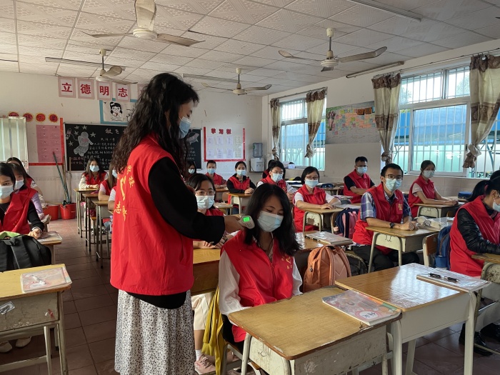 17日早上,學校開展防控模擬演練,模擬師生在上課期間有癥狀異常情況的處置流程。當堂教師在例行晨檢中,發現有“學生”發熱現象,老師立即讓該生佩戴好口罩,并引導其出班級,與其他學生保持距離,立即打電話,讓“保健老師”來復檢,保健老師將其帶到觀察室,初步判斷為疑似病例,立即上報學校防控負責人,再逐級上報到“鎮教育主管部門和疫情防控部門”。