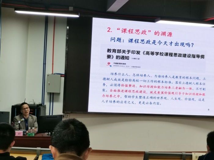 22下午,來自廣東職業技術學院的曹峰教授主講《課程思政的理論與實踐》,從課程思政的淵源與涵義、新時代課程思政的功能和意義、新時代課程思政的實踐探索等三方面進行闡述。曹峰教授引用康德的一段話“教師應當以教為命,以學為本,以人為目的”,明確課程思政歸根結底還是需要教師來引領學生,思政教師和專業教師的思政講授理解應當是不同的,作為一名教師,師德應有三種境界,最低是功利境界,教書僅為了更好的生活和生活,第二層境界是道德境界:教書還為了對得起學生與身份。最高的境界是審美境界:教書更為了實現自我價值與充實意義世界。