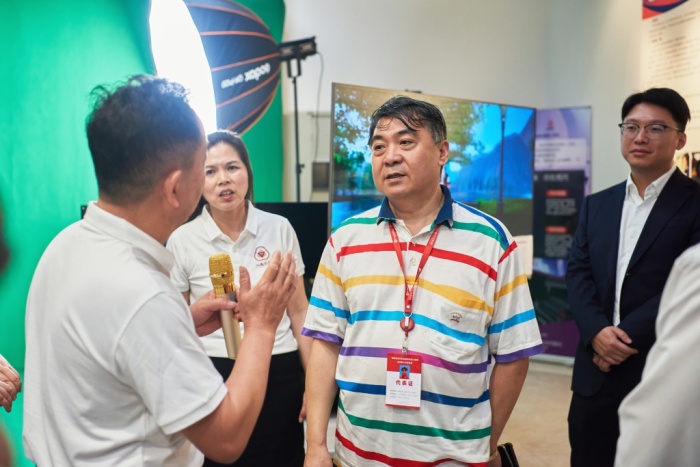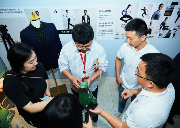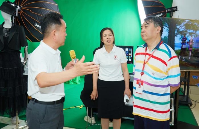 劉杰巡視員來到沙溪理工學校展區,了解學校專業特色和辦學成果。展區內,智芯服飾展出無縫工藝制造男裝,女生戰袍展出高級定制女士晚禮服,幗樣范展出中國紋樣系列女包,深受嘉賓們喜歡,不少人當場購買、加企業微信交流。特別是買它電商展區展示的元宇宙虛擬制片一體機技術,正在由兩位學生按照日常教學要求,通過綠幕及虛擬現實場景進行族服飾的直播銷售,吸引觀眾駐足。