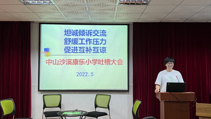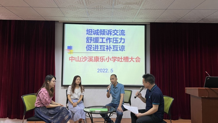 為了讓學校管理者和全體教師明晰困難困擾,發現問題矛盾,梳理負面清單;為了校務公開,坦誠溝通交流,促進團隊互相理解,凝聚共識;為了讓一線教師舒緩壓力,宣泄負面情緒;為了增加團隊互信、互補、互助、互尊、互諒;為了塑造有思想、有內涵、理性務實的和諧教師團隊。中山沙溪康樂小學于2022年5月23日舉行了一次特別的“吐槽大會”,活動主題為《坦誠傾訴交流,舒緩工作壓力,促進互補互諒》的“吐槽”大會,全體教師參與了本次“吐槽”活動。