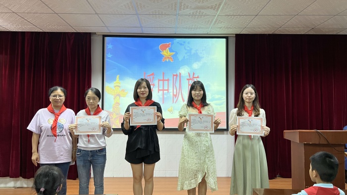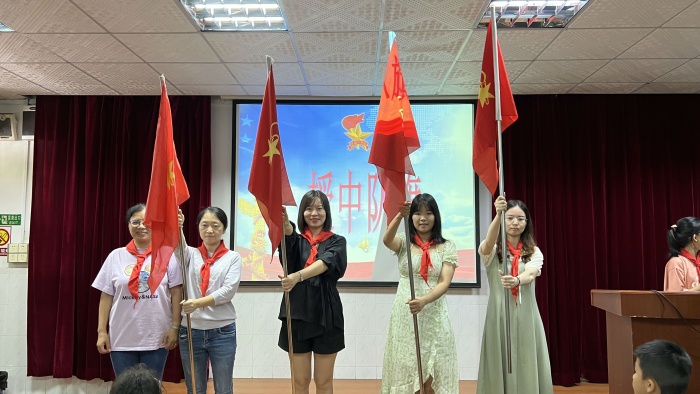 領巾飄揚,斗志昂揚,星星火炬閃耀著燦爛的光芒。在熱烈的掌聲中,阮副校長為新晉的四個中隊授旗,并為新聘輔導員頒發聘書、佩戴紅領巾和中隊旗。相信在新任的四位中隊輔導員的帶領下,新成立的四個中隊一定能展現全新的風貌。