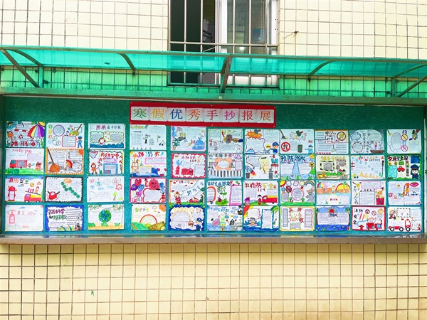 根據學校的要求,學生利用寒假時間開展形式多樣的實踐活動,有“防溺水”“交通安全”等不同主題的手抄報制作,有以“年味”為主題的實踐等。開學初,學校大隊部對學生寒假的德育作業進行收集與評選。每班各評選出5份優秀作業,共有120份精心認真完成的作品張貼于學校大堂和作品欄進行展示,供老師同學們欣賞學習。優秀作業展引來許多同學觀看,大家不時發出一陣陣贊嘆之聲。
