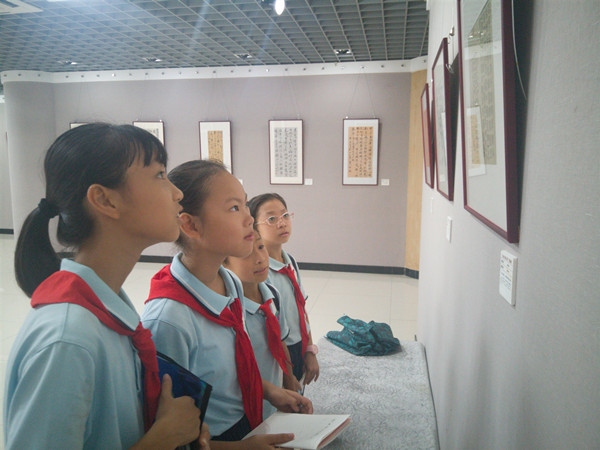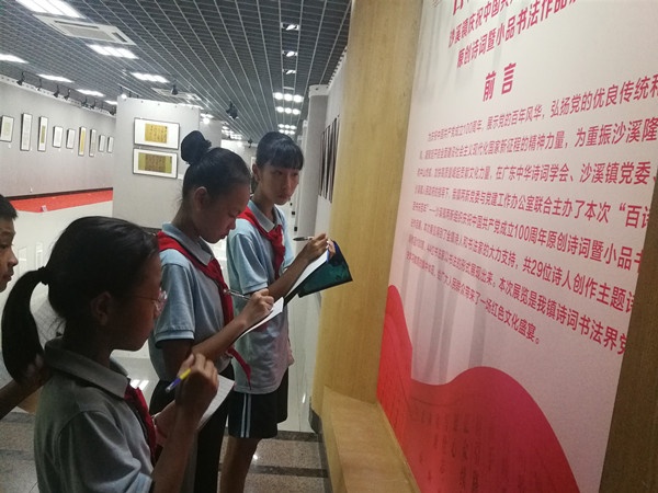 本次展覽旨在慶祝中國共產(chǎn)黨成立100周年,展示黨的百年風(fēng)華,弘揚(yáng)黨的優(yōu)良傳統(tǒng)和作風(fēng),凝聚起開啟全面建設(shè)社會主義現(xiàn)代化國家新征程的精神力量,重振沙溪龍威和中山虎威,加快高質(zhì)量崛起貢獻(xiàn)文化力量。本次展覽共有29位詩人創(chuàng)作主題詩詞作品,44位書法家以書法的形式展現(xiàn)紅色記憶。樂群小學(xué)少先隊(duì)代表一邊欣賞作品,一邊分享自己的感受心得,同時不忘認(rèn)真做筆記。