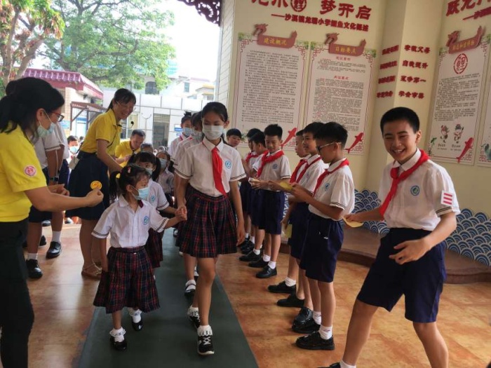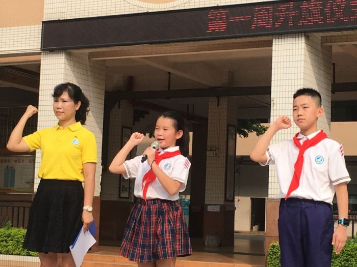 升旗儀式由隊(duì)干梁喬峰和鄭佩怡同學(xué)主持,首先進(jìn)行的是新生跨入龍門的儀式,六年級的哥哥姐姐向一年級小朋友親切地說:“你好,小弟弟(妹妹),讓哥哥(姐姐)帶你過龍門!” 哇哇哇,無比自豪!他們牽著弟弟妹妹的手一起跨入龍門了,一年級新同學(xué)還戴上了學(xué)校行政授予的“鯉魚標(biāo)志”,寓意從今天起,他們就正式成為龍小鯉了。