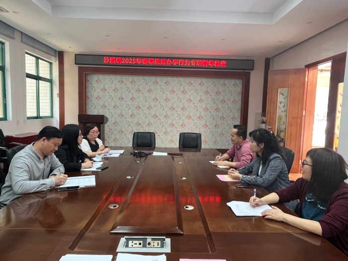 為落實國家“雙減”政策要求,加強中小學規范辦學行為管理,根據《沙溪鎮2023年春季規范辦學行為專項督導檢查的通知》要求,3月9日上午,由沙溪中學副校長肖林森、申明亭學校主任黃枚玉、濠涌小學主任雷艷組成的沙溪鎮規范辦學專項督導檢查組,到龍瑞小學開展2023年春季規范辦學行為專項督導檢查。龍瑞小學高玉璇校長、楊飛羽副校長接待了督導檢查組成員。