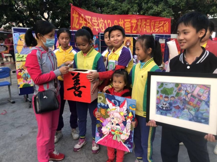 “各位叔叔阿姨,爺爺奶奶下午好,龍頭環(huán)學(xué)校書畫藝術(shù)作品義賣活動(dòng)正在進(jìn)行中,走過(guò)路過(guò)不要錯(cuò)過(guò),快來(lái)看看,把我們的作品帶回家吧!”學(xué)生紛紛當(dāng)起了小小銷售員,從一開始的膽怯,到后面拿著作品現(xiàn)場(chǎng)解說(shuō)推銷,通過(guò)這次活動(dòng),學(xué)生不但做了善事,還得到了鍛煉,家長(zhǎng)們表示孩子從中獲益良多。