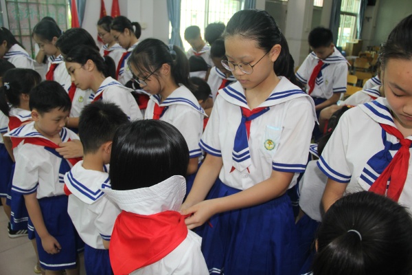 在莊嚴的出旗曲中,入隊儀式拉開了序幕,大隊長肖紫煊宣讀了組建一年級少先隊組織的決定和新隊員名單。在新隊員幸福的笑臉與期待中,六年級的老隊員為新隊員佩戴上了鮮艷的紅領巾。新隊員代表表示紅領巾將永遠激勵自己努力學習,爭取進步。同時,云漢小學少工委主任寧云志校長對成為少先隊員的新隊員表示祝賀,希望隊員們能肩負起少先隊員的責任和使命,將少先隊的光榮傳統傳承下去,不斷提高自我,完善自我,做新時代的好少年!