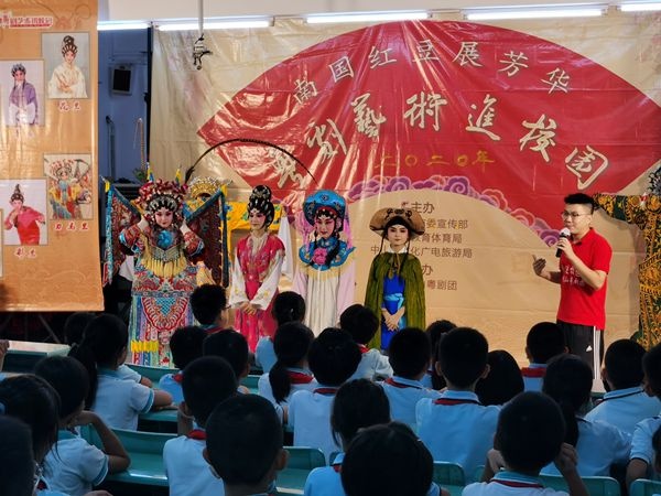 活動開始,由主持人尤海波講述粵劇歷史,介紹粵劇行當。粵劇行當分為:生、旦、凈、末、丑、外、小、貼、夫、雜十大行當,后來演變為“六柱制”:文武生、小生、正印花旦、二幫花旦、丑生、武生。通過講述粵劇歷史,從中啟發同學們對戲曲藝術的基本認識,讓更多青少年了解粵劇、熱愛傳統戲曲文化。